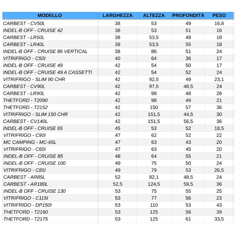 Tutte le misure e il peso di ogni frigorifero, in ordine crescente di larghezza.